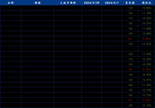 截止2024年4月7日,各原材料当日即时价格以及价格周环比情况如下: