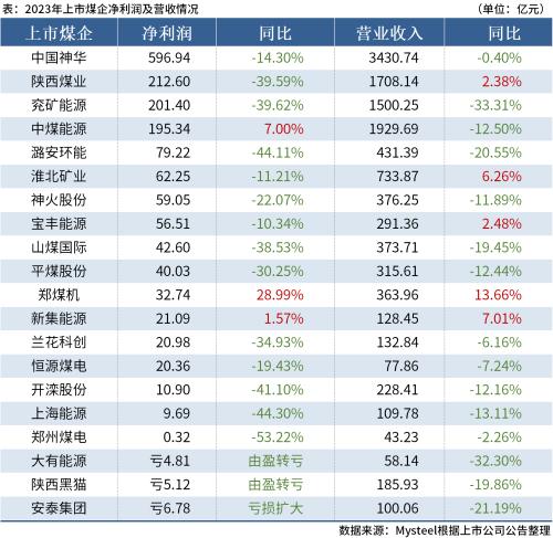 从营业收入来看,中国神华、中煤能源、陕西煤业和兖矿能源营收超过千亿元。具体情况如下: