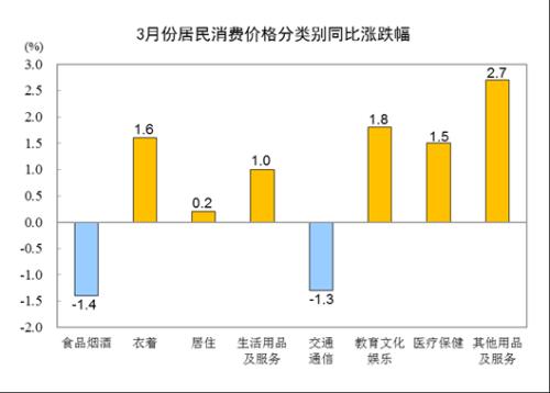 3月份,全国居民消费价格环比下降1.0%。其中,城市下降1.0%,农村下降0.7%;食品价格下降3.2%,非食品价格下降0.5%;消费品价格下降0.9%,服务价格下降1.1%。
