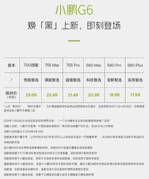 4月11日,小鹏G6 580长续航Plus版本正式上市,4月11日-30日限时优惠价17.99万元。