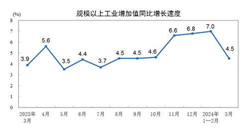 3月份,规模以上工业增加值同比实际增长4.5%(增加值增速均为扣除价格因素的实际增长率)。从环比看,3月份,规模以上工业增加值比上月下降0.08%。1—3月份,规模以上工业增加值同比增长6.1%。