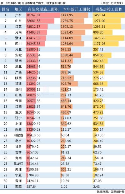 施工面积方面,31省市一季度的商品房屋施工面积共678501万平方米,排名前三的是广东、山东和江苏,其中广东施工面积超70000万平方米。