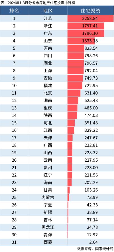 从住宅投资情况来看,江苏、浙江、广东和山东4省投资额突破千亿。西藏住宅投资额最少,仅为2.64亿元。