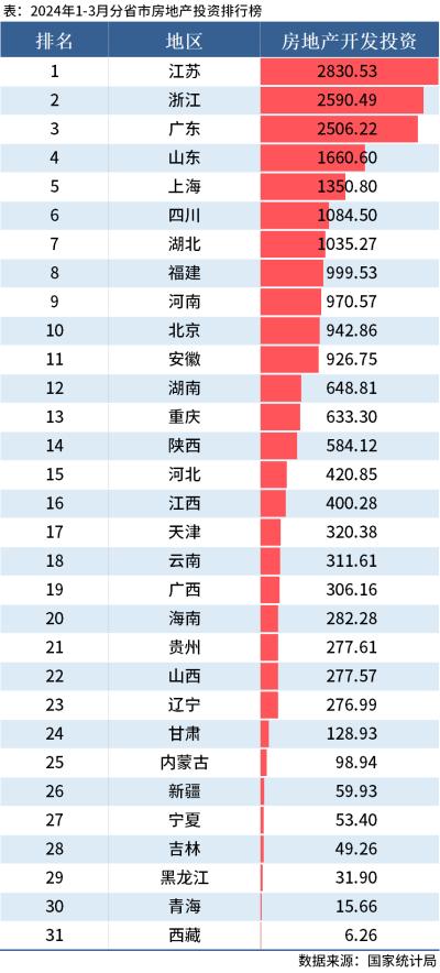 从房地产开发投资情况来看,24个省市投资额突破百亿,排在前三名的分别是江苏、浙江和广东,一季度投资额分别为2830.53亿元、2590.49亿元和2506.22亿元,投资额均在两千亿以上。西藏投资额最低,仅为6.26亿元。