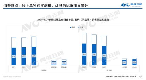 所以,企业对待烟灶需求,一定要用两个大品类,或者三个大品类的不同经营模式去看待。甚至要结合渠道去做不同的应对策略,因为电商、线下传统渠道、下沉渠道的需求分布都会因人群的不同而不同。从奥维云网(AVC)监测数据看,一季度下沉套餐的比重约在40%-45%之间,与电商差异明显。