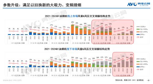 参数上,23m³/min及以上大风量是标配,但不构成溢价能力;25m³/min及以上大风量且为1000Pa+变频大风压是高端标配,有一定溢价能力,但也不强。据奥维云网(AVC)监测数据,2024年一季度线上23m³/min及以上大风量产品保持高速增长,其中增长最为明显的是1000Pa及以上大风压产品;线下25m³/min及以上大风量产品销额占比已经高达43%,且基本同时配置1000Pa及以上大风压。