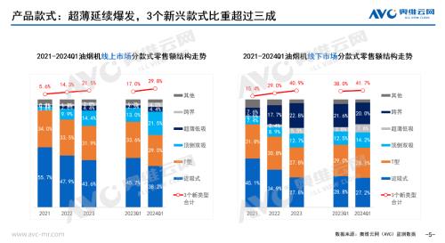 款式上,趋势向“薄”延续爆发,三个细分款式共性是薄,且主流的T型、近吸式也在变“薄”。据奥维云网(AVC)监测数据,2024年一季度超薄低吸、顶侧双吸、跨界三个类型产品线上销额比重增长至29.8%,线下增长至41.7%。此外,近吸式、T型在头部品牌的创新与引领下,也在逐步朝着更薄方向发展。比如方太的新月系列、老板电器的双腔系列。相对而言,油烟机的参数是有止境的,但是薄及美是无止境的,这也决定着溢价在哪里。