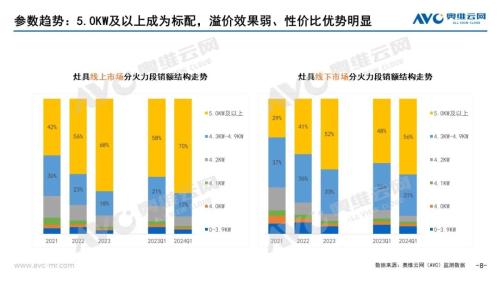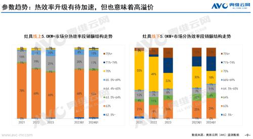 从产品的角度看,5.0KW及以上大火力产品仍在渗透,溢价效果弱但性价比优势明显;65%、70%及以上高热效率产品溢价高,但是增速放缓;可调节底盘的产品延续增长,价格趋稳。
