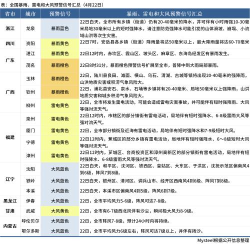 据Mysteel不完全统计,4月22日,浙江、四川、广东等地发布暴雨预警,广西钦州局部地区有50毫米以上强降雨;福建多地发布雷电黄色预警,伴有短时强降雨、大风等强对流天气;黑龙江、辽宁、内蒙古多地发布大风蓝色预警,阵风可达7-8级。具体情况如下: