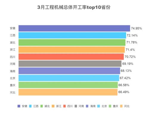数据显示,3月全国工程机械开工率为55.52%,较之1月2月,开工率实现大幅提升。19个省份当月开工率超过全国开工率平均值,安徽、江西、湖北、浙江、四川开工率为全国前五,均超过70%。3月份,北京、甘肃、黑龙江、河南等16个省份,均创下自2023年12月以来最好成绩。