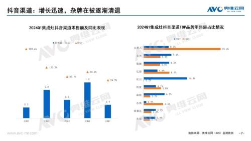 2024年一季度,抖音渠道成为集成灶行业唯一增长的渠道(奥维监测维度)且已经形成一定规模,奥维云网(AVC)监测数据显示,2024年一季度抖音渠道集成灶零售额同比增长24.9%,销量与声量双增长,随着大品牌的逐渐进入,抖音渠道的竞争秩序与产品质量会逐步得到优化。