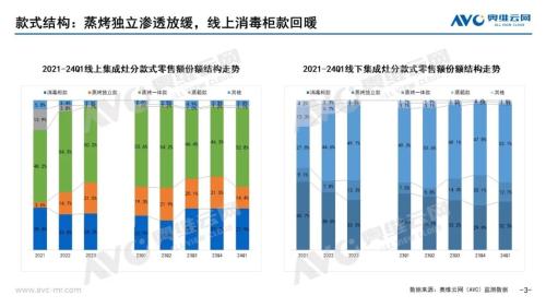 第二,对于改善用户来说,一部分消费者会选择价格相对较低的消毒柜款集成灶,这使得产品的溢价能力减弱、行业的结构升级速度放缓,奥维云网(AVC)监测数据显示,2024年一季度线上消毒柜款额占比为27.9%,同比上涨5个百分点,相较于23年全年上涨3.7个百分点。消费大环境下,“可以将就”、“谁坏换谁”等思维会影响部分消费者的换新,使需求释放延后。