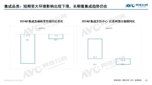 2024年一季度,受到消费大环境的影响,我国集成厨电市场表现不尽人意。集成灶、集成洗碗机、线下集成烹饪中心均出现不同程度的下滑。奥维云网(AVC)推总数据显示,2024年一季度我国集成灶市场累计零售额、量分别为42亿元、45万台,同别分别下滑11.9%、10.5%;奥维云网(AVC)监测数据显示,2024年一季度我国集成洗碗机市场线上、线下零售额同比分别下滑31.3%、5.0%;集成烹饪中心灶蒸烤部分线上零售额同比增长96.7%,线下零售额同比下滑28.0%。
