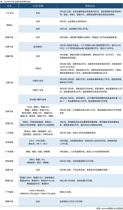 据Mysteel不完全统计,截至4月23日,国内共有16家车企公布2024年3月购车优惠政策,其中,吉利汽车推出,多款车型以旧换新至高立减5.3万元,换新金融礼至高10万元免息贷等。理想汽车22日宣布,全系降价1.8万元-3万元。具体如下: