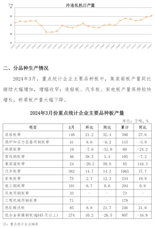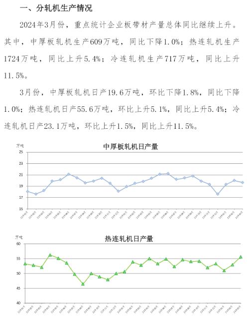 2024年3月份,重点统计企业板带材产量总体同比继续上升其中,中厚板轧机生产609万吨,同比下降1.0%;热连轧机生产1724万吨,同比上升5.4%;冷连轧机生产717万吨,同比上升11.5%。