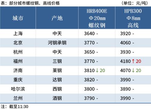 ◎济南:28日早盘建材市场价格跌20,螺纹莱钢3750、莱钢永锋3750、石横特钢3750、敬业3730,盘螺石横特钢4040、莱钢永锋4040。(单位:元/吨)