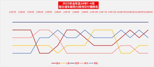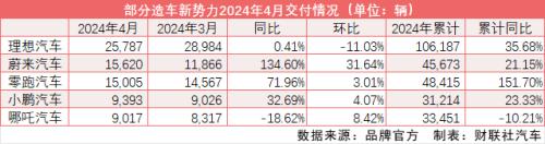 重新回到交付排名第二名的蔚来汽车4月交付15620辆,同比增长134.6%,从4月初以来蔚来汽车的降价策略正在显现出效果。4月1日,蔚来汽车曾推出最高10亿元的油车置换补贴,油车用户置换蔚来2024款新车;在现有政策外,还将获得额外1万元的选装基金补贴。5月伊始,蔚来汽车再度推出“0首付”购车方案,“以旧换新”可享最高20000元专属补贴。