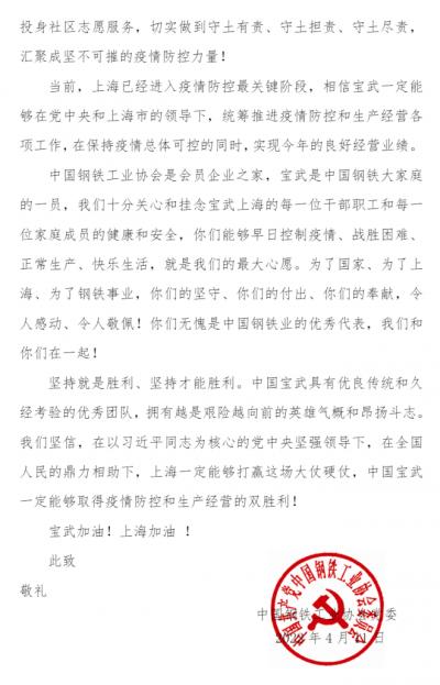 中国钢铁工业协会是会员企业之家,宝武是中国钢铁大家庭的一员,我们十分关心和挂念宝武上海的每一位干部职工和每一位家庭成员的健康和安全,你们能够早日控制疫情、战胜困难、正常生产、快乐生活,就是我们的最大心愿。为了国家、为了上海、为了钢铁事业,你们的坚守、你们的付出、你们的奉献,令人感动、令人敬佩!你们无愧是中国钢铁业的优秀代表,我们和你们在一起!