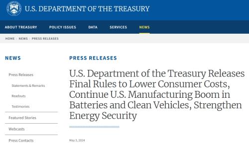 当地时间周五,美国财政部公布税收抵免最终规则时做出了这一调整。税收抵免旨在鼓励电动汽车生产,推动矿产和电池供应链进入美国。