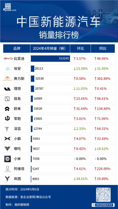 据Mysteel不完全统计,截至5月6日,13家新能源汽车企业发布2024年4月新能源汽车销量数据。从同比来看,10家车企实现正增长,其中赛力斯以302.89%的增长位列第一,阿维塔以226%的增长位列第二。具体如下: