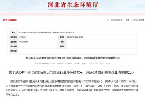 4月28日,河北省生态环境厅发布了《关于2024年河北省重污染天气重点行业环保绩效A、B级和绩效引领性企业清单的公示》(以下简称“公示”)。