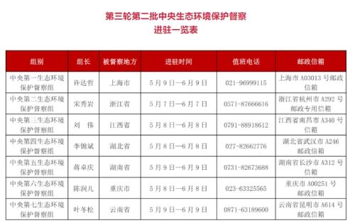 根据工作安排,第三轮第二批中央生态环境保护督察进驻时间为1个月。进驻期间,各督察组分别设立专门值班电话和邮政信箱,受理被督察地方生态环境保护方面的来信来电信访举报,受理举报电话时间为每天8:00—20:00。督察组全体成员将严格执行纪律要求,接受被督察地方和社会监督。在后续工作中,将严格落实中央有关要求,进一步为基层减负,简化程序、优化流程,不断提高督察工作的精准性、针对性,确保有序有效完成督察任务。