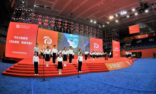 随后,70名学生代表为学校献词,大会在北京科技大学校歌《北科华章》的歌声中落下帷幕。