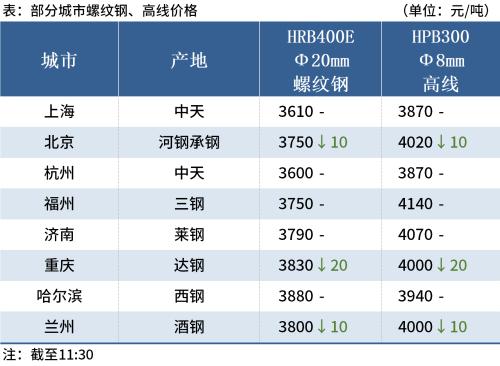 ◎重庆:15日早盘建材市场价格跌20,现达钢螺3750、盘4000,永航/泸钢螺3740,盘3990。(单位:元/吨)