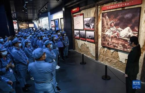 在红军长征湘江战役纪念馆的油画《陈树湘》前,党员们聆听讲解员讲述陈树湘为苏维埃流尽最后一滴血的故事(2021年5月18日摄)。新华社记者张爱林摄