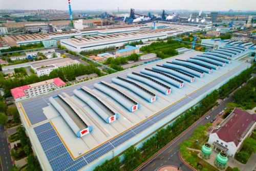 5月4日,新天钢集团天钢公司首个光伏发电项目俯瞰(如图)。4月26日,该光伏发电项目并网试运行,这是目前天津市钢铁行业中光伏发电装机容量最大的一个项目。据悉,2021年6月份,该公司利用棒材、高线、中厚板厂房,耐材库、合金库房等5处屋顶面积约10万平方米,建设光伏系统,总计安装光伏组件19160块。天钢公司整个厂区年生活用电360万度。项目投产后,预计年发电量960万度,满足厂区生活用电后还可以用于生产,每年可减少碳排放8600吨。(张改红/文何增晓/摄)