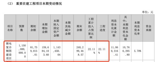 目前,宝明科技赣州复合铜箔项目仍在建设,公司在互动平台表示,赣州一期项目达产后年产锂电复合铜箔约1.5亿平米。该项目于2022年7月公告,项目计划总投资60亿元人民币,项目一期拟投资11.5亿元,年报显示,截至2023年年底,该项目累计投入2.4亿元,工程进度为22.11 %。