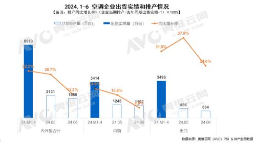 小满已过,盛夏将至,国内空调销售旺季也即将到来。然而经历了几个月高增之后,6月排产已有所放缓。根据奥维云网(AVC)最新排产监测数据,6月国内家用空调企业总排产1856万台,其中内销排产1192万台,同比增长4.9%;外销排产664万台,同比增长24.6%,相比于上月排产,内外销增速双双放缓。