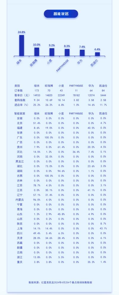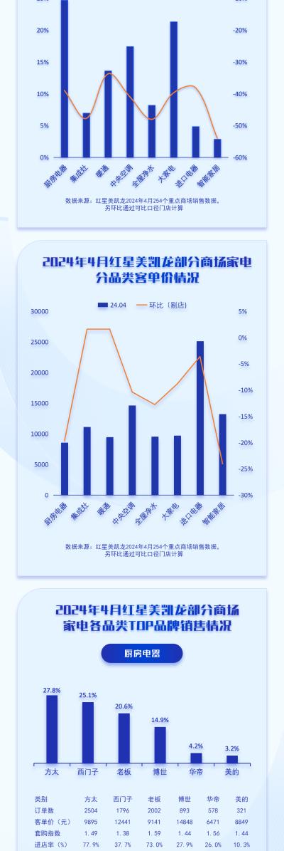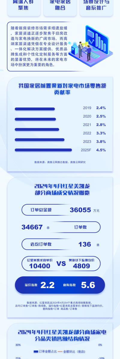 2024年4月,红星美凯龙重点商场零售额36055万元,订单数34667单,客单价远超线下零售家电卖场监测均价。数据显示2024年4月,红星美凯龙家电产品溢价指数2.2,套购指数5.6,套购指数较24年3月略有回升。