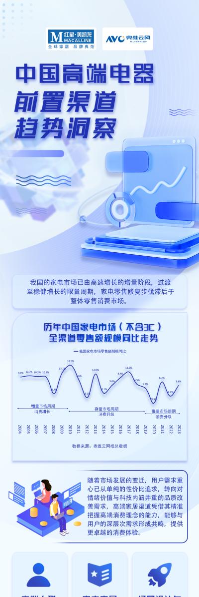 基于家电更新换代与家电家居融合的主流趋势,奥维云网(AVC)洞察提炼出五种家电消费趋势:首先是传统大家电市场渐趋成熟,新兴品类发展蓬勃,以洗碗机、嵌入式微蒸烤、清洁电器及净水系统为代表的新兴品类保持近10%的增速,持续深化用户基础;其次是消费低迷与需求升级并存,高端与品质追求并进,带动国内家电市场高端产品销售额稳步攀升。奥维云网(AVC)监测数据显示,2024年一季度线下市场15000元以上的电视、10000以上的冰箱的零售额占比分别达到27.1%和39.3%;第三,绿色消费观兴起,节能环保成为新风尚,叠加以旧换新各项补贴刺激政策引导。2024年一季度线下市场,冰箱一级能效产品销量份额逼近80%,空调一级能效产品销量份额达到90%;第四,健康意识强化,后疫情时代催生家电健康属性需求,持续影响消费决策。健康家电如干衣机、清洁电器及净水设备在2024年一季度的零售额同比分别达18.2%、21.7%与7.7%,领先行业平均增速;第五,家电家居的美学融合成新趋势,家电与家居环境的和谐共生成为设计新方向,体现为超薄电视、嵌入式冰箱等产品的热销,2024年一季度线下市场超轻薄电视、嵌入式冰箱的零售额占比分别为14%和48%。