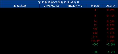 截止2024年5月24日,各原材料当日即时价格以及价格周环比情况如下: