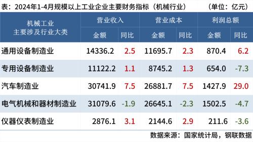 其中,机械工业主要涉及行业大类中,通用设备制造业增长6.2%,专用设备制造业下降7.3%,汽车制造业增长29%,电气机械和器材制造业下降4.7%,仪器仪表制造业下降3.6%。