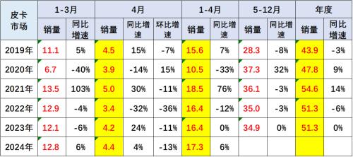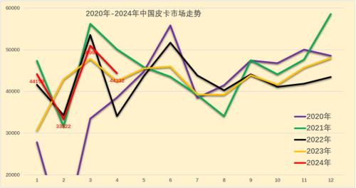 2024年4月份皮卡市场销售4.4万辆,同比增长4%,环比下降13%,处于近5年的中高位水平。由于去年4月皮卡基数相对正常,因此今年的增速表现较好。今年1-4月的皮卡销量17.3万辆,实现同比增长6%,总体表现不错。