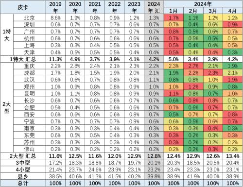 皮卡市场主力销售区域还是在以中小城市和县乡市场为主,但县乡市场春节前的表现相对偏弱。2024年4月中型城市和北京等限购市场表现较好。而县乡市场持续稳定,大城市市场目前来看并没有明显的突破特征。
