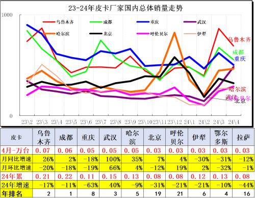 全国皮卡主力城市目前是乌鲁木齐、成都、重庆、武汉、哈尔滨等西南、东北和西北地区。大城市需求有一定规模。鄂尔多斯、伊犁、呼伦贝尔等矿业和特色种植业主力地区的皮卡需求也很强。