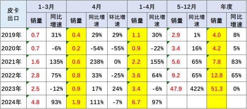 2024年4月份皮卡市场销售4.4万辆,同比增长4%,环比下降13%,处于近5年的中高位水平。由于去年4月皮卡基数相对正常,因此今年的增速还是不错的。