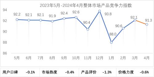 以2019年1月为基期,2024年4月整体市场产品竞争力指数为91.3,环比下滑0.8个点;从三大细分市场来看,轿车和SUV市场环比分别下滑0.5和1.2个点,而MPV市场环比上升0.1个点。