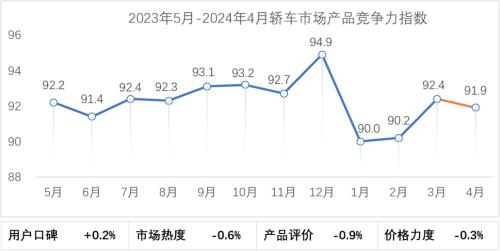 总体来看,2024年4月轿车市场产品竞争力指数为91.9,环比下滑0.5个点,其中产品评价、市场热度和价格力度指标环比均下滑,下滑幅度分别为0.9、0.6和0.3个点,而用户口碑指标环比上升0.2个点。