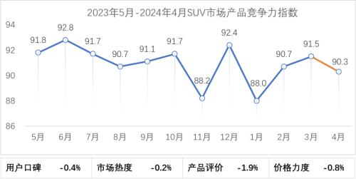 总体来看,2024年4月SUV市场产品竞争力指数为90.3,环比下滑1.2个点,其中产品评价、价格力度、用户口碑和市场热度指标环比均下滑,下滑幅度分别为1.9、0.8、0.4和0.2个点。