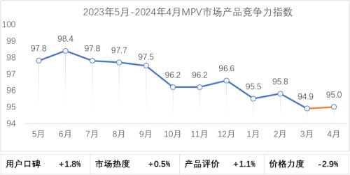 总体来看,2024年4月MPV市场产品竞争力指数为95.0,环比上升0.1个点,其中用户口碑、产品评价和市场热度指标环比均上升,上升幅度分别为1.8、1.1和0.5个点,而价格力度指标环比下滑2.9个点。