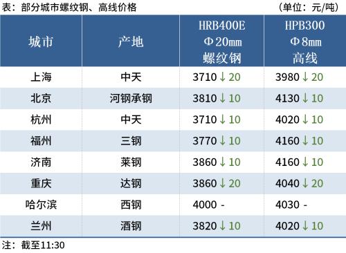 ◎杭州:29日早盘建材市场价格下跌10。螺纹:沙钢3940,中天3680,西城3660,浙江华宏3640,抗震永钢3710,富鑫3650,线材:亚新3910,盘螺中天4040,联鑫黄海3960,抗震盘螺:中新钢铁3970。(单位:元/吨)