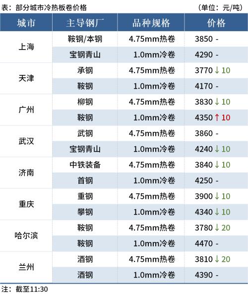 ◎武汉:29日早盘冷轧市场价格下调10,1.0宝钢青山卷4240,1.5卷4210,3.0卷4640。(单位:元/吨)