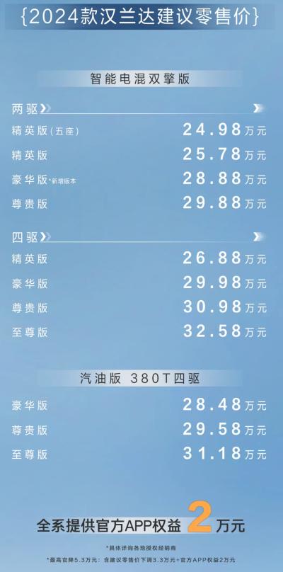 5月31日,广汽丰田2024款汉兰达正式上市,售价区间24.98-32.58万元。