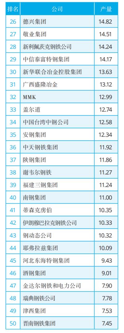 手册公布了2023年全球钢铁企业粗钢产量前50名。其中,中国宝武钢铁集团稳居榜首,安赛乐米塔尔位列第二名,鞍钢集团位列第三名。上榜的中国钢企超过榜单半数,具体排名如下: