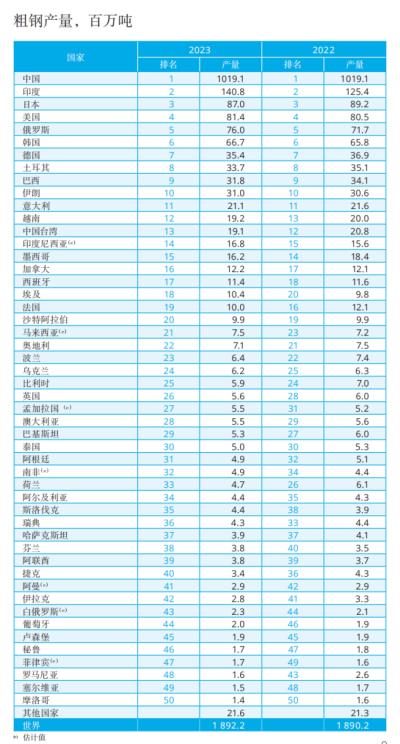 2023年和2022年主要钢铁生产国粗钢产量排名如下: