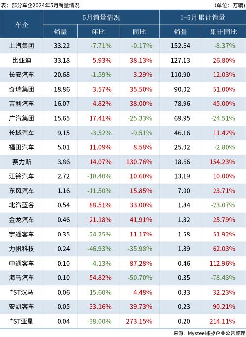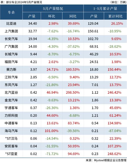 据Mysteel不完全统计,截至2024年6月11日,已有20家车企公布5月产销数据。5月汽车销量排名前三的车企为上汽集团、比亚迪和长安汽车,汽车销量分别为33.22万辆、33.18万辆和20.68万辆。